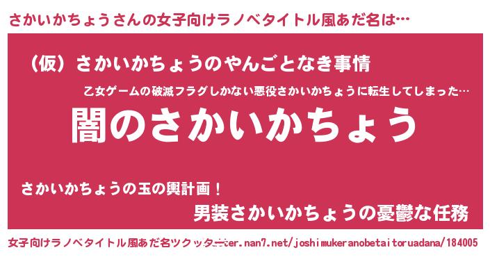 | 男性向けラノベタイトル風あだ名 | 『Re:さかいかちょうから始める異世界生活』 |