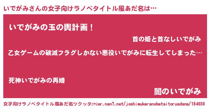 | 男性向けラノベタイトル風あだ名 | 『この素晴らしい世界にいでがみを!』 |