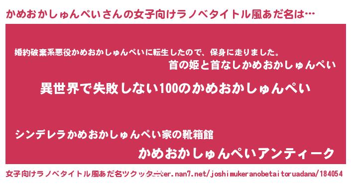 | 男性向けラノベタイトル風あだ名 | 『かめおかしゅんぺいという概念が存在しない退屈な世界 』 |