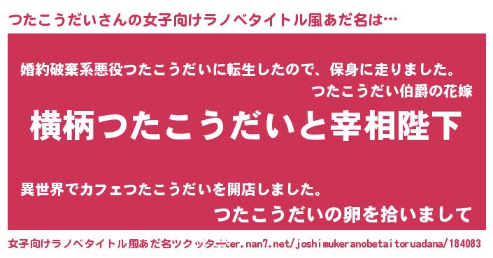 つたこうだいさんの女子向けラノベタイトル風あだ名は… 『横柄つたこうだいと宰相陛下』『婚約破棄系悪役つたこうだいに転生したので、保身に走りました。』『つたこうだいの卵を拾いまして』 ツクッター #女子向けラノベタイトル風あだ名ツクッター http://tkutter.nan7.net/joshimukeranobetaitoruadana/184083/