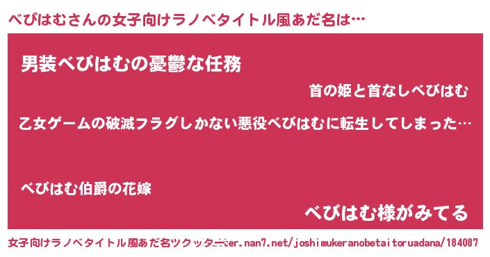 | 男性向けラノベタイトル風あだ名 | 『この素晴らしい世界にべびはむを!』 |