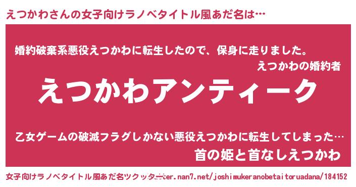 | 意味不明あだ名 | 『自称えつかわ』『めかぶ科えつかわ属』 |