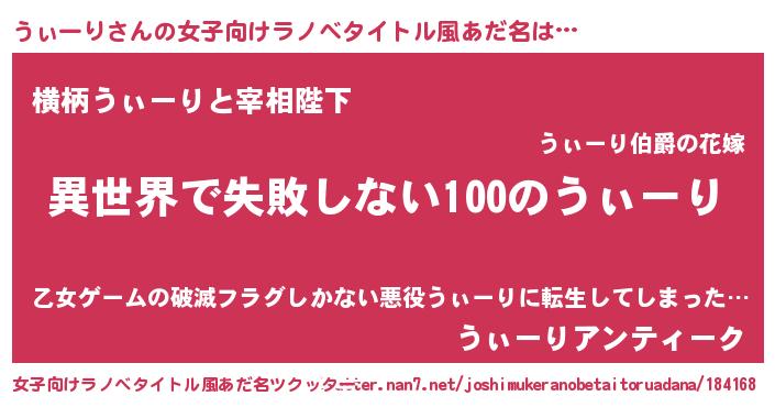 | 男性向けラノベタイトル風あだ名 | 『うぃーりという概念が存在しない退屈な世界 』 |