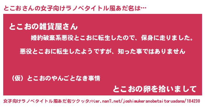 | 男性向けラノベタイトル風あだ名 | 『この素晴らしい世界にとこおを!』 |