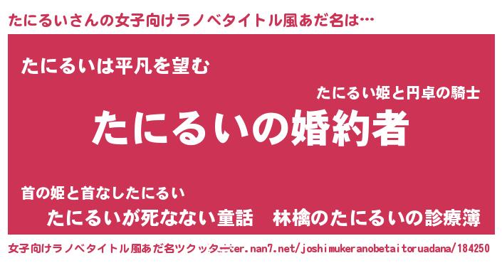 たにるいさんの女子向けラノベタイトル風あだ名は… 『たにるいの婚約者』『たにるいは平凡を望む』『たにるいが死なない童話 林檎のたにるいの診療簿』 ツクッター #女子向けラノベタイトル風あだ名ツクッター http://tkutter.nan7.net/joshimukeranobetaitoruadana/184250/