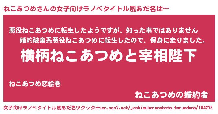 ねこあつめさんの女子向けラノベタイトル風あだ名は… 『横柄ねこあつめと宰相陛下』『悪役ねこあつめに転生したようですが、知った事ではありません』『ねこあつめの婚約者』 ツクッター #女子向けラノベタイトル風あだ名ツクッター http://tkutter.nan7.net/joshimukeranobetaitoruadana/184275/