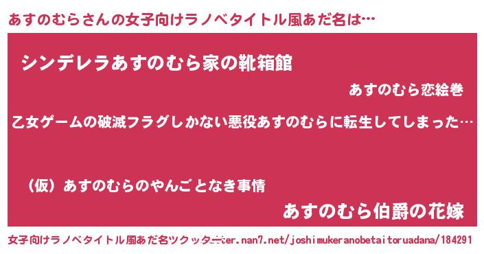 | 男性向けラノベタイトル風あだ名 | 『この素晴らしい世界にあすのむらを!』 |