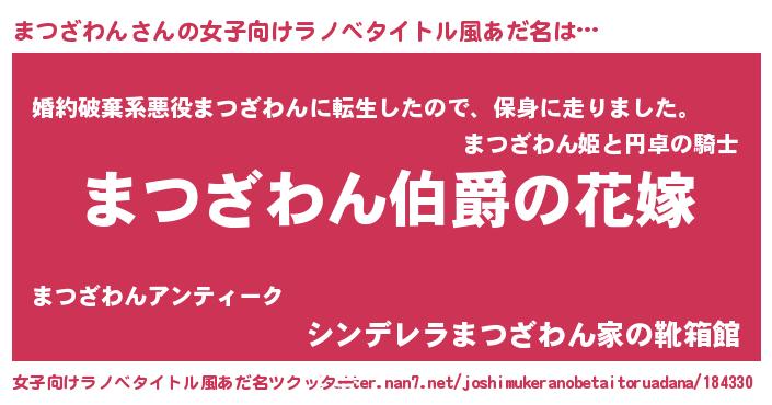 | 男性向けラノベタイトル風あだ名 | 『うちの娘の為ならば、俺はもしかしたらまつざわんも倒せるかもしれない。』 |