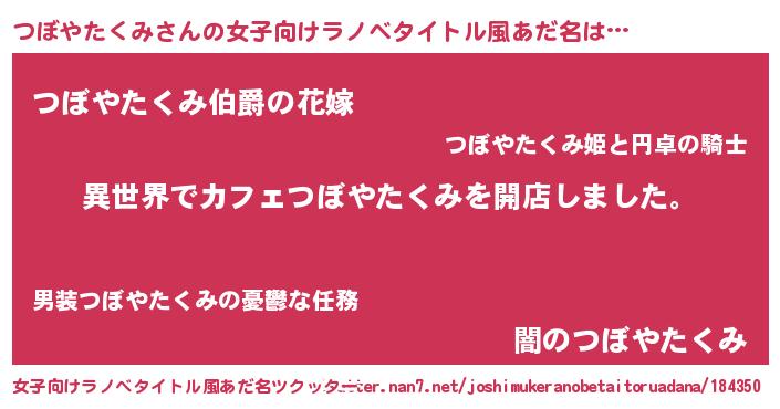 | 男性向けラノベタイトル風あだ名 | 『誰もが恐れるあのつぼやたくみが、ぼくの専属メイドになるようです。』 |