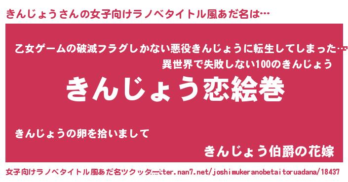 きんじょうさんの女子向けラノベタイトル風あだ名は… 『きんじょう恋絵巻』『乙女ゲームの破滅フラグしかない悪役きんじょうに転生してしまった…』『きんじょう伯爵の花嫁』 ツクッター #女子向けラノベタイトル風あだ名ツクッター http://tkutter.nan7.net/joshimukeranobetaitoruadana/18437/