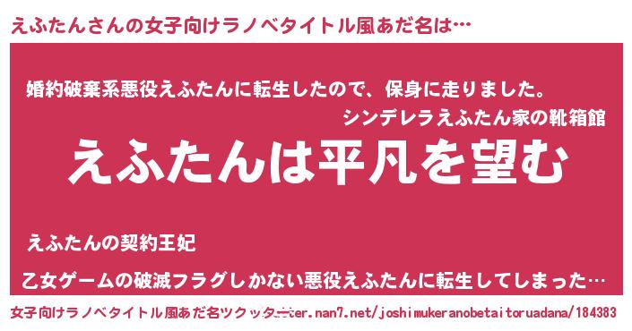 | 男性向けラノベタイトル風あだ名 | 『ダンジョンにえふたんを求めるのは間違っているだろうか』 |