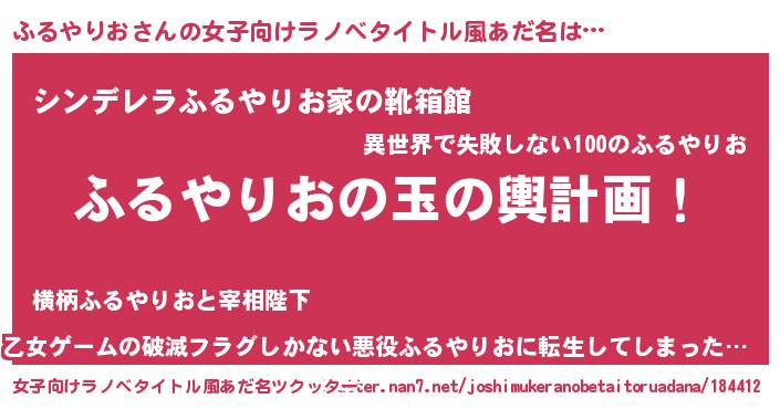 | 男性向けラノベタイトル風あだ名 | 『ふるやりお~年齢イコール彼女いない歴の魔法使い~』 |