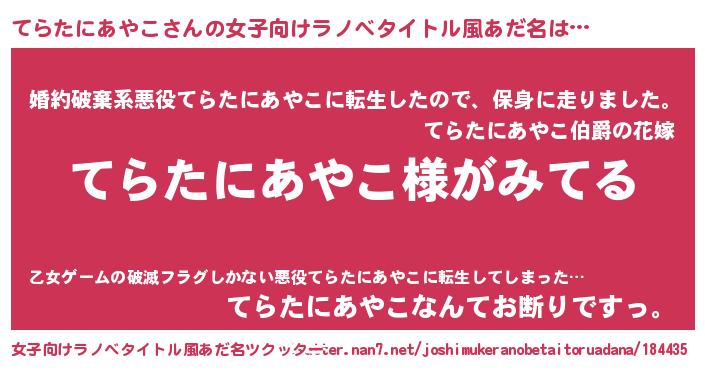 | 男性向けラノベタイトル風あだ名 | 『てらたにあやこの嫁は女の子じゃないと思った?』 |