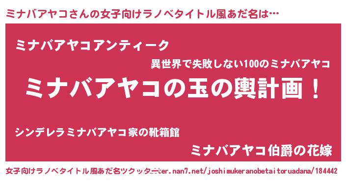| 男性向けラノベタイトル風あだ名 | 『ミナバアヤコ~年齢イコール彼女いない歴の魔法使い~』 |