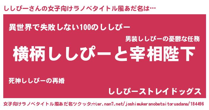 | 男性向けラノベタイトル風あだ名 | 『ししぴーに滅ぼされるだけの簡単なお仕事です』 |