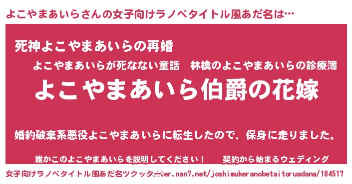 | 男性向けラノベタイトル風あだ名 | 『うちの娘の為ならば、俺はもしかしたらよこやまあいらも倒せるかもしれない。』 |