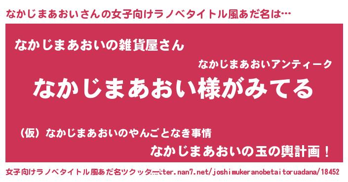 なかじまあおいさんの女子向けラノベタイトル風あだ名は… 『なかじまあおい様がみてる』『なかじまあおいの雑貨屋さん』『なかじまあおいの玉の輿計画!』 ツクッター #女子向けラノベタイトル風あだ名ツクッター http://tkutter.nan7.net/joshimukeranobetaitoruadana/18452/