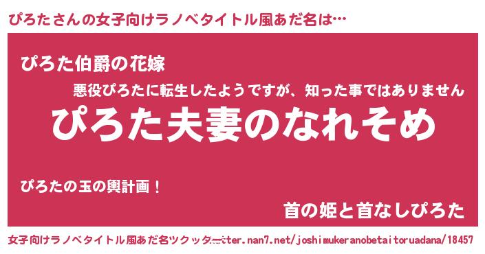 | 男性向けラノベタイトル風あだ名 | 『おまえをオタクにしてやるから、俺をぴろたにしてくれ! 』 |