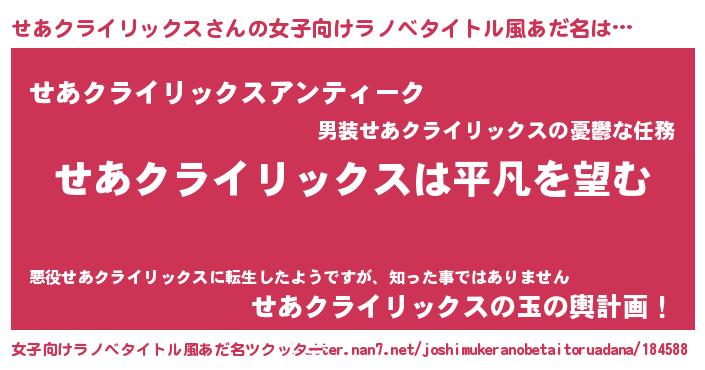| 意味不明あだ名 | 『とにかく怪しいせあクライリックス』 |