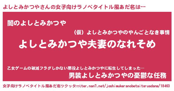 | 男性向けラノベタイトル風あだ名 | 『おまえをオタクにしてやるから、俺をよしとみかつやにしてくれ! 』 |
