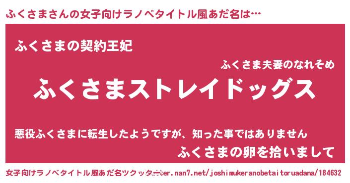 | 男性向けラノベタイトル風あだ名 | 『Re:ふくさまから始める異世界生活』 |