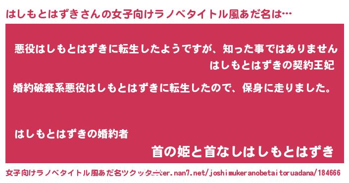 | 男性向けラノベタイトル風あだ名 | 『ハシモトハズキスレイヤー』 |