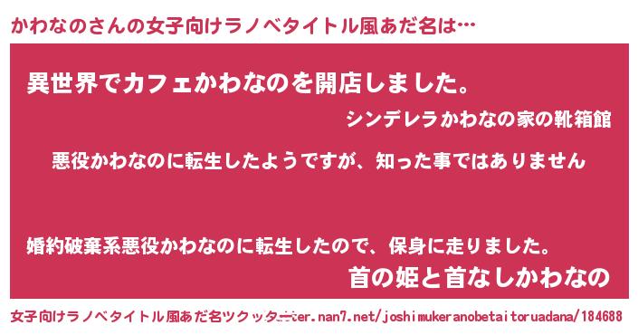| 男性向けラノベタイトル風あだ名 | 『この素晴らしい世界にかわなのを!』 |