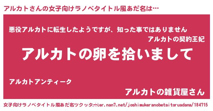 | 男性向けラノベタイトル風あだ名 | 『アルカトの嫁は女の子じゃないと思った?』 |