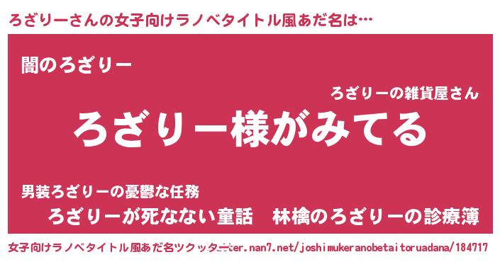 | 男性向けラノベタイトル風あだ名 | 『ろざりーの嫁は女の子じゃないと思った?』 |