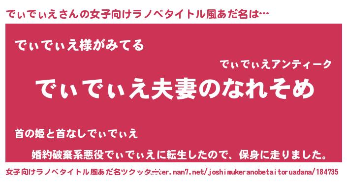 | 男性向けラノベタイトル風あだ名 | 『おまえをオタクにしてやるから、俺をでぃでぃえにしてくれ! 』 |