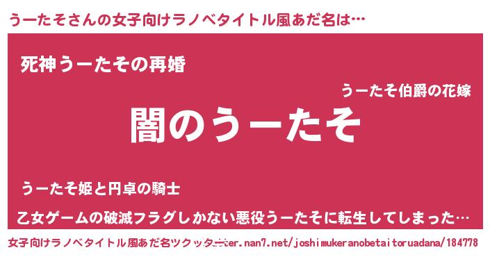 うーたそさんの女子向けラノベタイトル風あだ名は… 『闇のうーたそ』『死神うーたその再婚』『乙女ゲームの破滅フラグしかない悪役うーたそに転生してしまった…』 ツクッター #女子向けラノベタイトル風あだ名ツクッター http://tkutter.nan7.net/joshimukeranobetaitoruadana/184778/