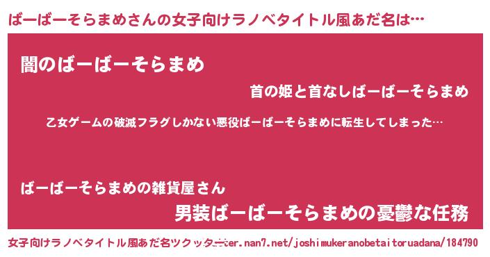 | 胡散臭い通販商品みたいなあだ名 | 『世界中を虜にした100年もののヴィンテージワイン…その名も「ばーばーそらまめ」』 |