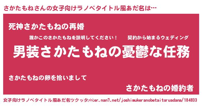 さかたもねさんの女子向けラノベタイトル風あだ名は… 『男装さかたもねの憂鬱な任務』『死神さかたもねの再婚』『さかたもねの婚約者』 ツクッター #女子向けラノベタイトル風あだ名ツクッター http://tkutter.nan7.net/joshimukeranobetaitoruadana/184833/