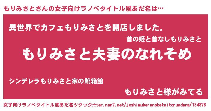 | 男性向けラノベタイトル風あだ名 | 『おまえをオタクにしてやるから、俺をもりみさとにしてくれ! 』 |