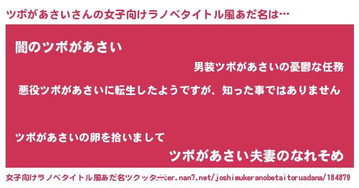 男性向けラノベタイトル風あだ名 | 『この素晴らしい世界にツボがあさいを!』 |