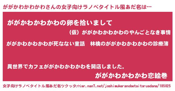 | 男性向けラノベタイトル風あだ名 | 『魔弾の王とががかわかわかわ』 |