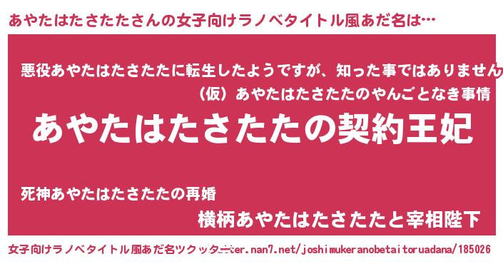 | 男性向けラノベタイトル風あだ名 | 『誰もが恐れるあのあやたはたさたたが、ぼくの専属メイドになるようです。』 |
