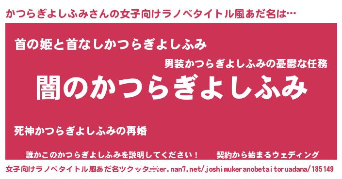 | 男性向けラノベタイトル風あだ名 | 『Re:かつらぎよしふみから始める異世界生活』 |