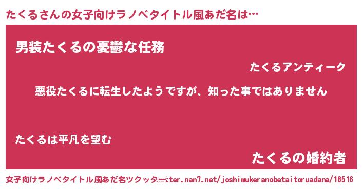 | 男性向けラノベタイトル風あだ名 | 『この素晴らしい世界にたくるを!』 |