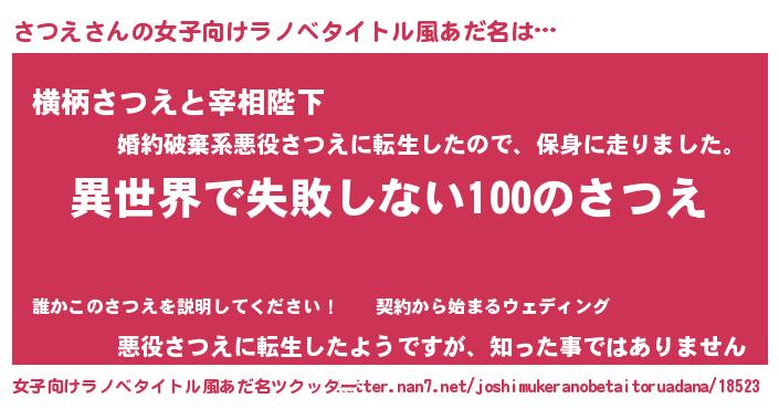 | 男性向けラノベタイトル風あだ名 | 『さつえという概念が存在しない退屈な世界 』 |