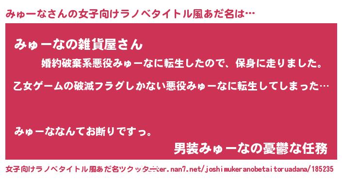 | 男性向けラノベタイトル風あだ名 | 『魔弾の王とみゅーな』 |