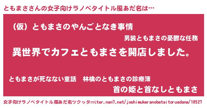 | 男性向けラノベタイトル風あだ名 | 『誰もが恐れるあのともまさが、ぼくの専属メイドになるようです。』 |