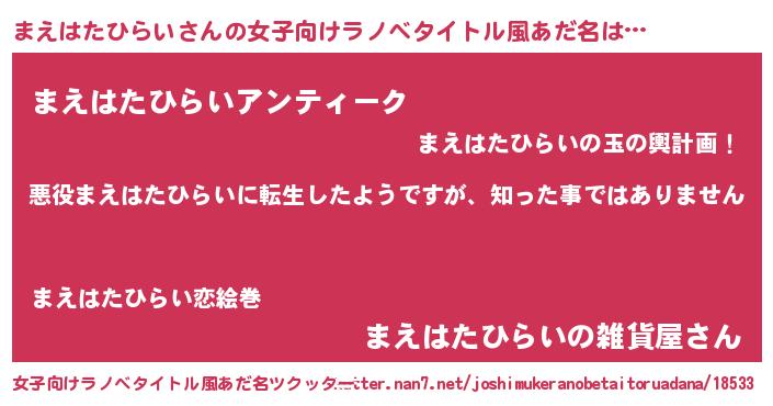 | 男性向けラノベタイトル風あだ名 | 『この素晴らしい世界にまえはたひらいを!』 |