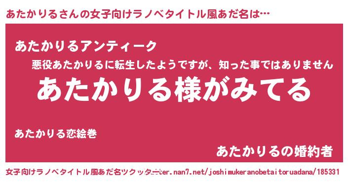 | 男性向けラノベタイトル風あだ名 | 『あたかりるの嫁は女の子じゃないと思った?』 |