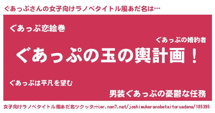 | 男性向けラノベタイトル風あだ名 | 『ぐあっぷ~年齢イコール彼女いない歴の魔法使い~』 |