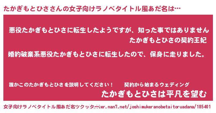 | 男性向けラノベタイトル風あだ名 | 『転生したらたかぎもとひさだった件』 |
