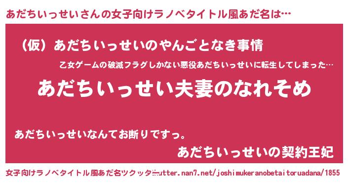 | 男性向けラノベタイトル風あだ名 | 『おまえをオタクにしてやるから、俺をあだちいっせいにしてくれ! 』 |