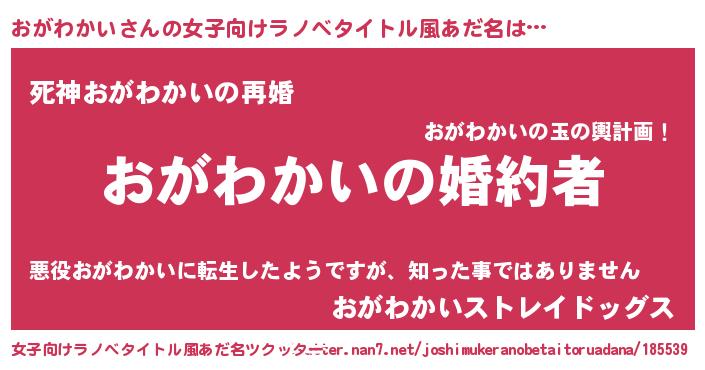 | 男性向けラノベタイトル風あだ名 | 『うちの娘の為ならば、俺はもしかしたらおがわかいも倒せるかもしれない。』 |