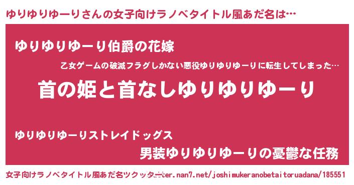 ゆりゆりゆーりさんの女子向けラノベタイトル風あだ名は… 『首の姫と首なしゆりゆりゆーり』『ゆりゆりゆーり伯爵の花嫁』『男装ゆりゆりゆーりの憂鬱な任務』 ツクッター #女子向けラノベタイトル風あだ名ツクッター http://tkutter.nan7.net/joshimukeranobetaitoruadana/185551/