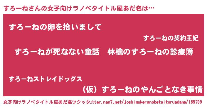 | 男性向けラノベタイトル風あだ名 | 『魔弾の王とすろーね』『すろーねの憂鬱』 |